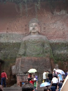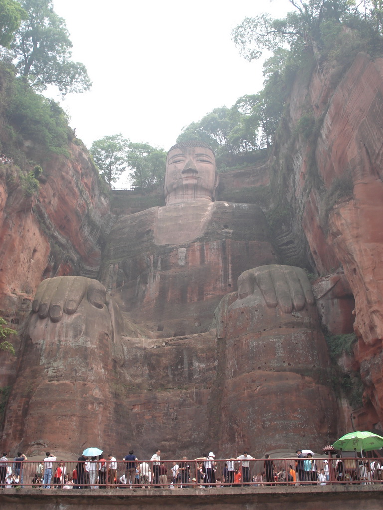 The Leshan Giant Buddha 乐山大佛 le shan da fou (wikipedia) is a 71-metre (233 ft) tall stone statue, built between 713 and 803. It is carved out of a cliff face of Cretaceous red bed sandstones that lies at the confluence of the Min River and Dadu River in the southern part of Sichuan province in China, near the city of Leshan.