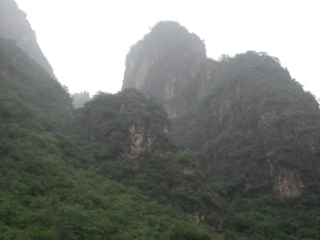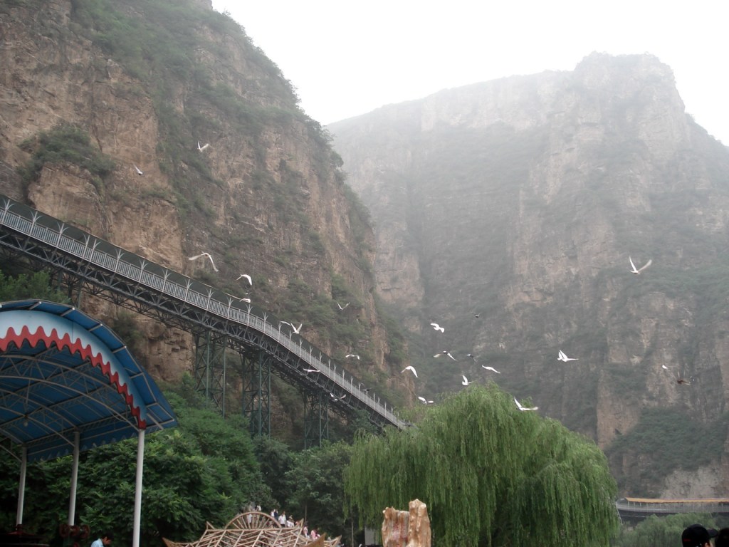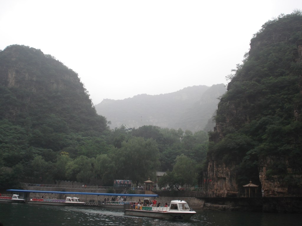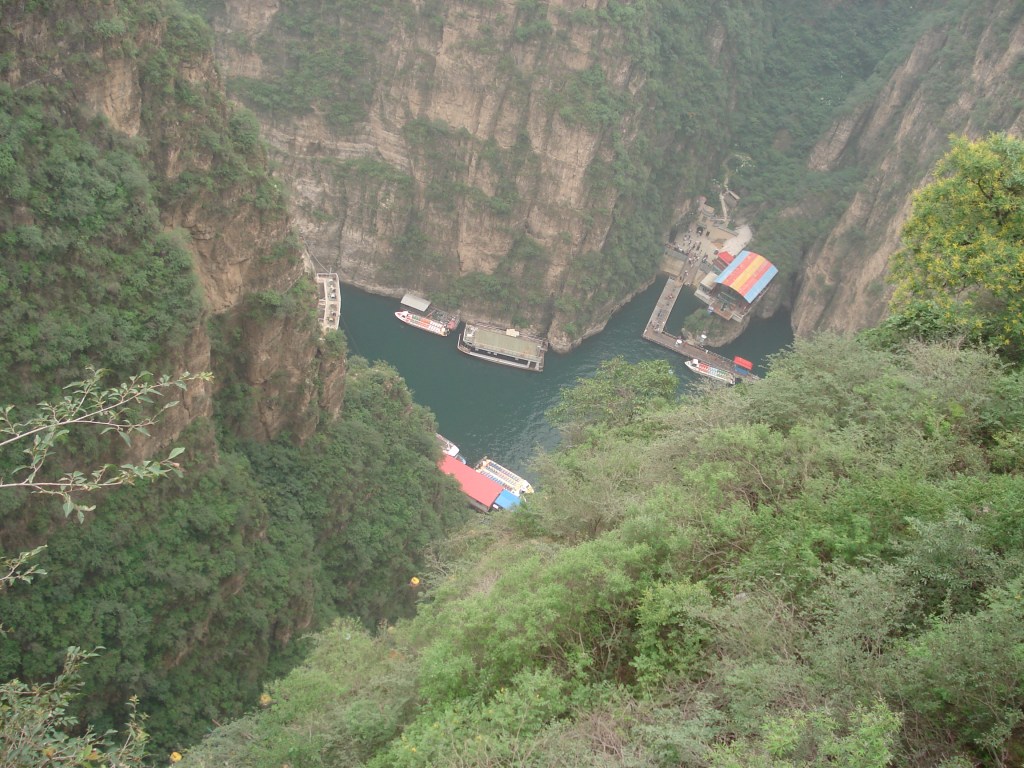 Long Qing Xia 龙庆峡, often called Long Qing Xia Gorge. The gorge, reputed to be the “Little Three Gorges”, features clear water, wooded mountains, and wonderful karst caves. The gorge’s main attractions are the Longqing Gorge Cruise, Baihua (hundred Flowers) Cave, and the Shenxianyuan (Immortal) and Jingang temples. Near the entrance, a grand waterfall plummets down 50 meters (164 feet) from the dam above. A long, dragon-shaped escalator carries visitors to the dam, where the cruise begins. On both sides, eerie mountains and strange formations inspire visitors’ imaginations as they have for centuries. You can marvel at the huge, natural Buddha stone and a hill rising from the water like a great bell. Another hill, named Fengguan (Phoenix Coronet) Isle, is considered the symbol of the gorge. Fengguan is surrounded on three sides by water and closed off by high mountains on the fourth. (credit)