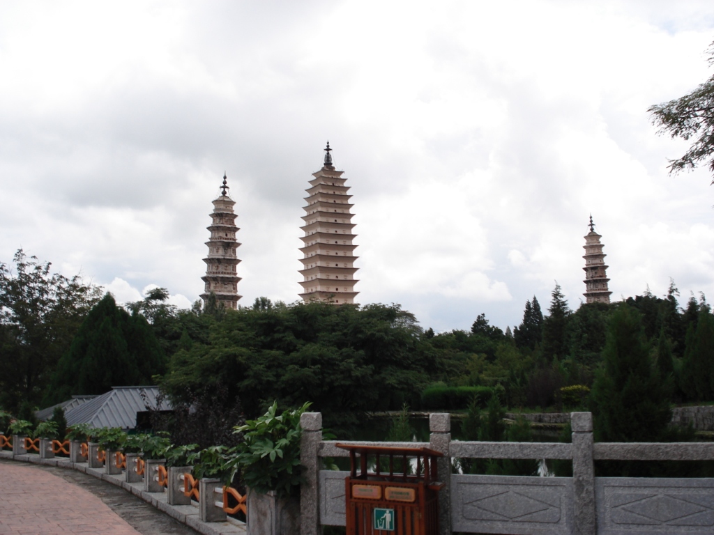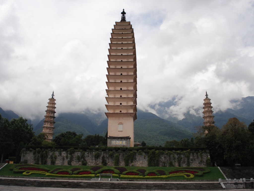 The Three Pagodas of the Chongsheng Temple (崇圣寺三塔; Chóngshèng Sì Sāntǎ) are an ensemble of three independent pagodas arranged on the corners of an equilateral triangle, near the old town of Dali, Yunnan province, China, dating from the time of the Kingdom of Nanzhao and Kingdom of Dali in the 9th and 10th centuries.