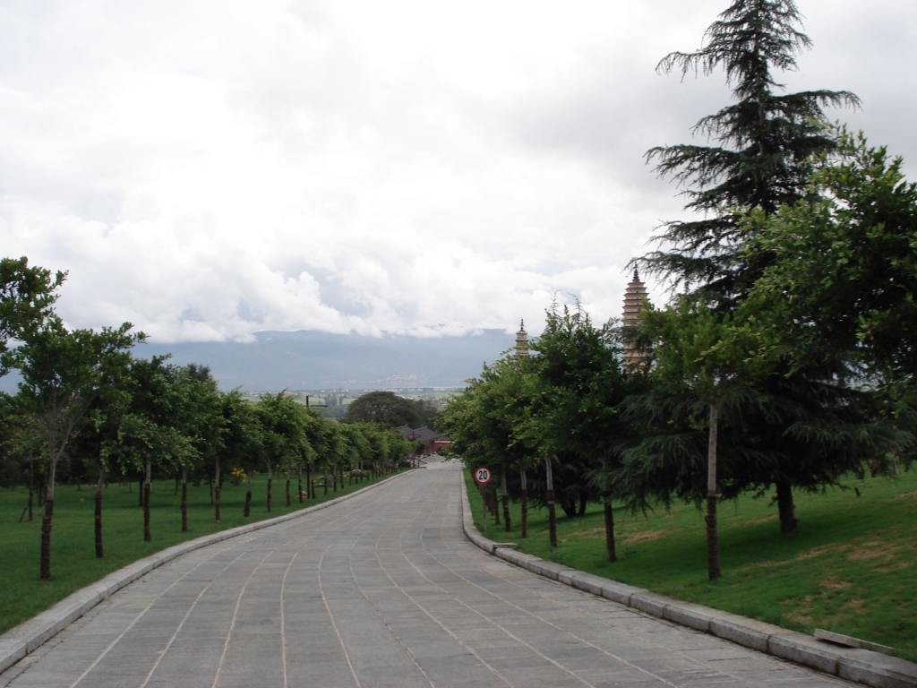 The Three Pagodas are located about 1.5 km (0.93 mi) north of Dali old town. They are at the east foot of the tenth peak of the massive Cangshan Mountains and face the west shore of the Erhai Lake of ancient Dali.
