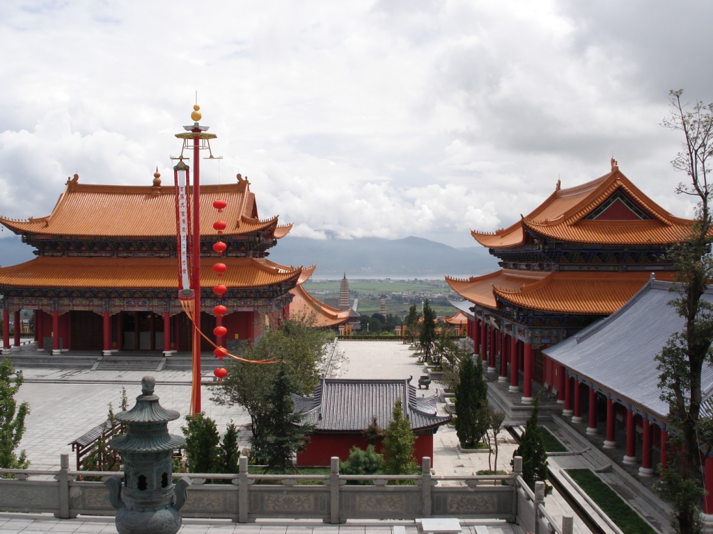 The main pagoda, known as Qianxun Pagoda (千寻塔; Qiānxún Tǎ), reportedly built during 823-840 CE by king Quan Fengyou (劝丰佑) of the Kingdom of Nanzhao, is 69.6 meters (227 feet) high and is one of the tallest pagodas in China’s history. The central pagoda is square shaped and composed of sixteen stories; each story has multiple tiers of upturned eaves. There is a carved shrine containing a white marble sitting Buddha statue at the center of each façade of every story. The body of the pagoda is hollow from the first to the eighth story, surrounded with 3.3 meters (10 feet) thick walls. In 1978, more than 700 Buddhist antiques, including sculptures made of gold, silver, wood or crystal and documents, were found in the body during a major repairing work. The designers of the pagoda are supposed to have come from Chang’an (present-day Xi’an), the capital of Tang Dynasty at that time and the location of another pagoda, Small Wild Goose Pagoda, which shares the similar style but is one hundred years older.