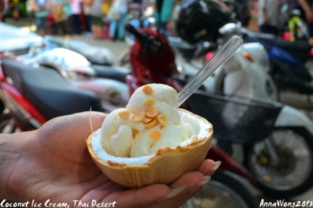 Coconut Ice Cream, I found this snack while browsing before go to Thailand. And saw k-pop boyband 2PM eat it when they visit Thailand. Then I’m curious, what is it? The seller seperate the meat and water. The coconut has a fresh water, so delicious and freshly. Then they add coconut ice cream inside the coconut, and ask me for topping and I choose nuts. So Delicious..