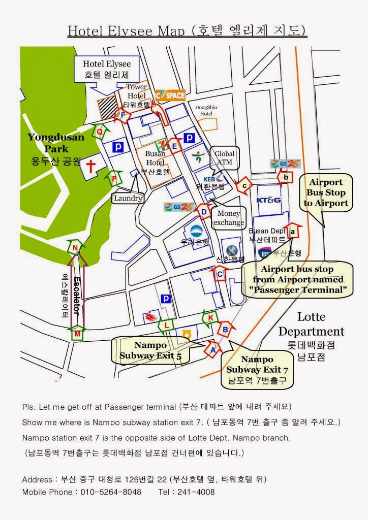 Elysee Motel Busan located near Exit 5 or 7 of Nampo Station. The owner give me email of map direction to the hotel from either exit. Altough it’s only took 5-10 minutes by walk, but because it’s hill-up, and we bring our heavy luggage, it tooks more time.