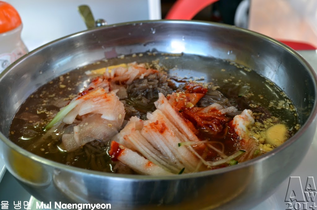 We also ordered cold noodles, 물 냉면 Mul Naengmyeon. It is served as a cold soup with the noodles contained in broth made from beef, chicken or dongchimi.