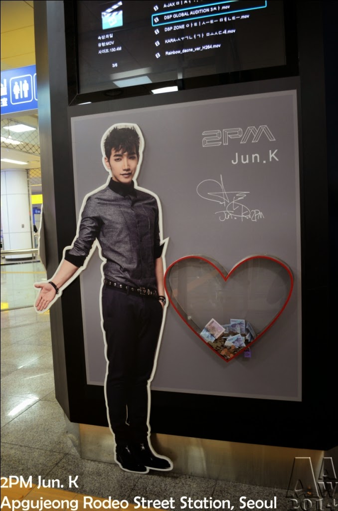 We decided to stop at Apgujeong Rodeo Street Station. At the station, we can found 2PM 2D stand-picture.