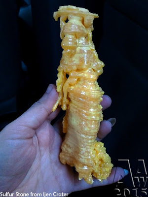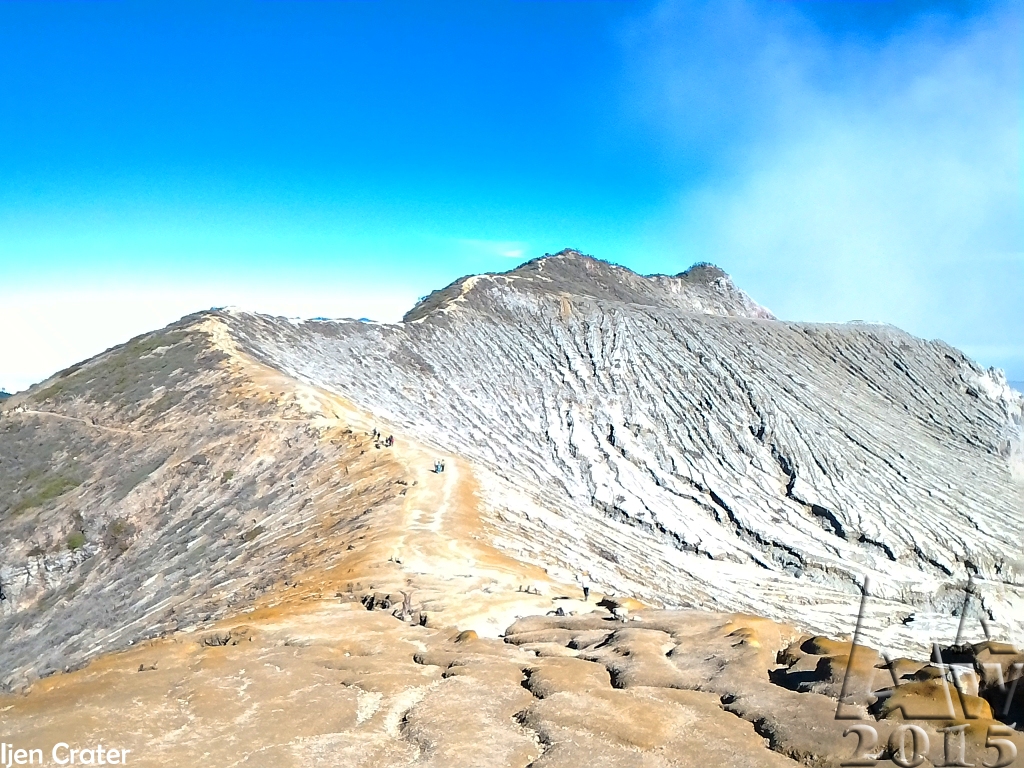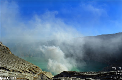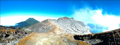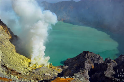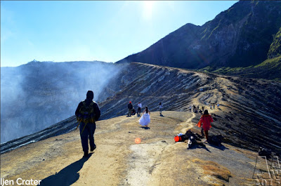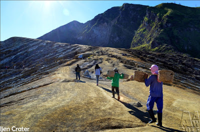 West of Gunung Merapi is the Ijen volcano, which has a one-kilometer-wide turquoise-colored acidic crater lake. The lake is the site of a labor-intensive sulfur mining operation, in which sulfur-laden baskets are carried by hand from the crater floor. The work is paid well considering the cost of living in the area, but is very onerous. Workers earn around Rp 50,000 – 75,000 ($5.50-$8.30) per day and once out of the crater, still need to carry their loads of sulfur chunks about three kilometers to the nearby Paltuding Valley to get paid.