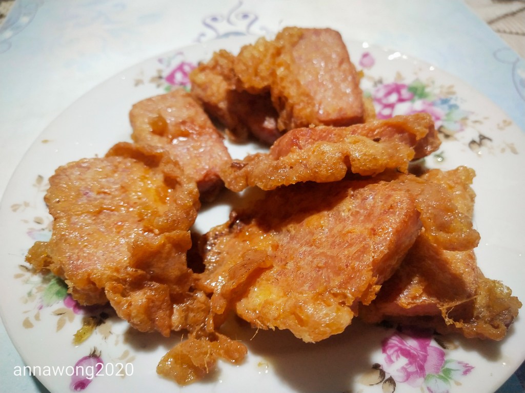 Just mixed egg, and put the canned meat inside the mixed egg, and deep fried it. I like a little cripy one so I will fry it until yellow gold color. Eat it with rice, so delicious.