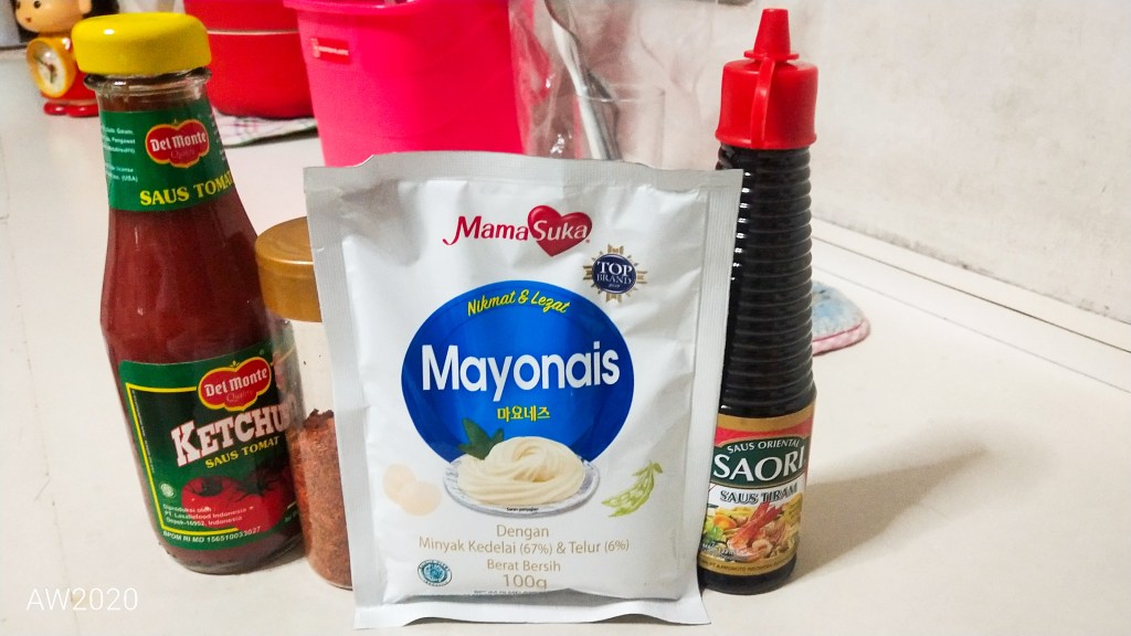Fry the garlic, onion, and bird’s eye chili in the butter, until smelling. Then pour the tomato sauce, mayonnaise, soy sauce, oyster sauce into it, give a little water (if you like the sauce to be thick, don’t give too much water). Pour the sugar, mixed it well. Taste it, if you think it’s not spicy enough, you can add the chili powder. If you like sweet, you can add the sugar.