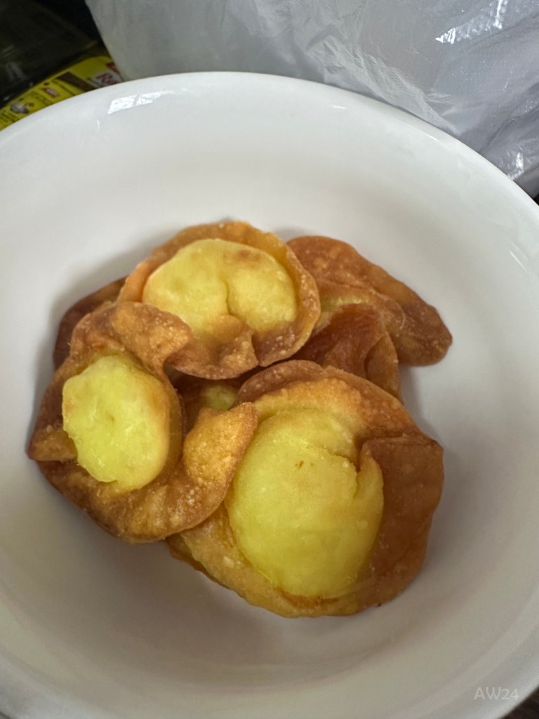 I bought some minched shrimp and put it inside the the dumpling skin. And after it was fried, I just realize that the minched shrimp is not only shrimp, but there’s some fish inside, so the taste is not the one that I wanted to make.